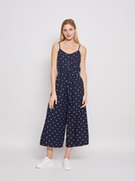 Женский летний комбинезон на лямках, выполненный из лёгкой ткани с узором в горошек и дополненный поясом на талии создаст комфортный стильный образ для тёплой погоды.